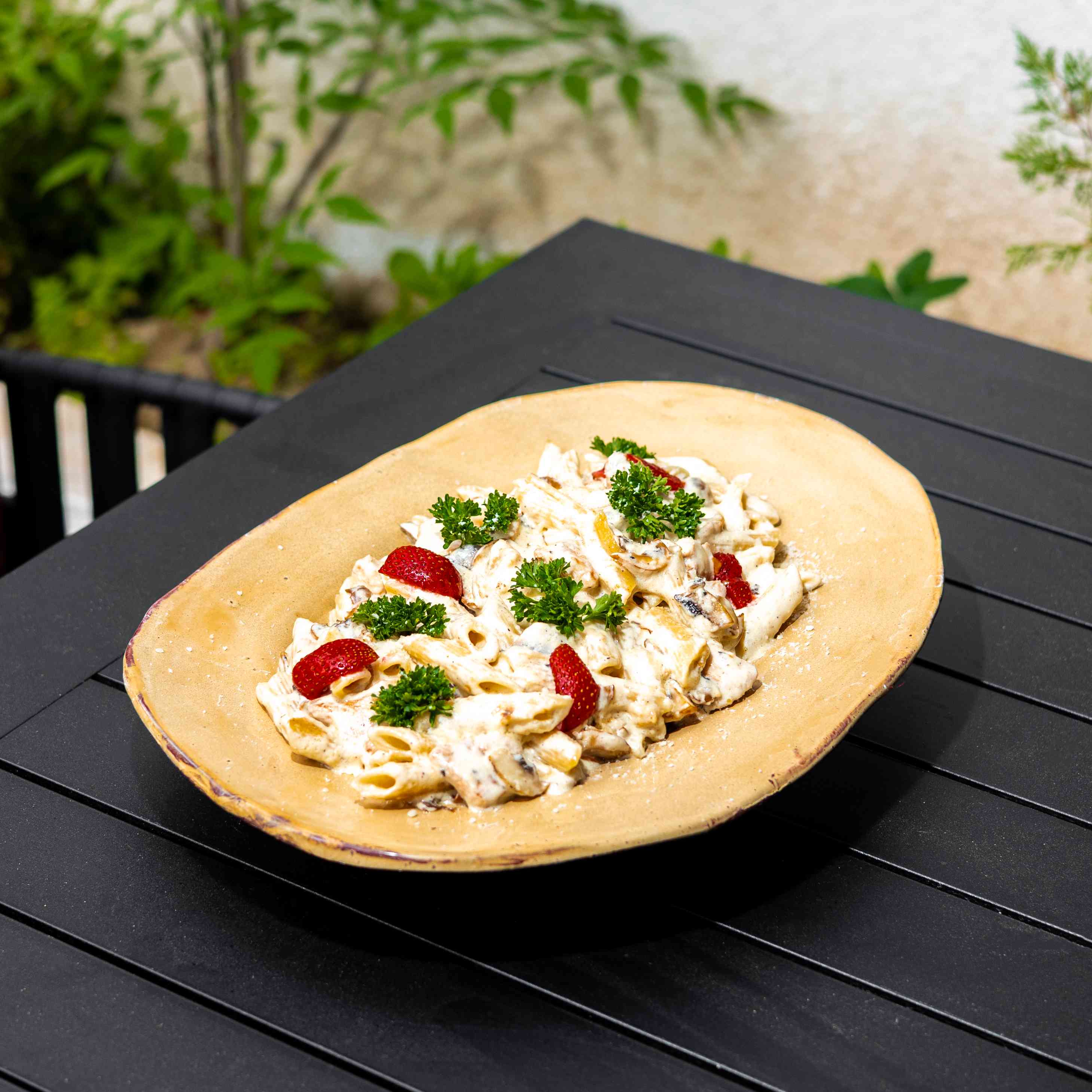 Chicken julienne. Blanched mushrooms. Alfredo sauce. Penne. Parmesan