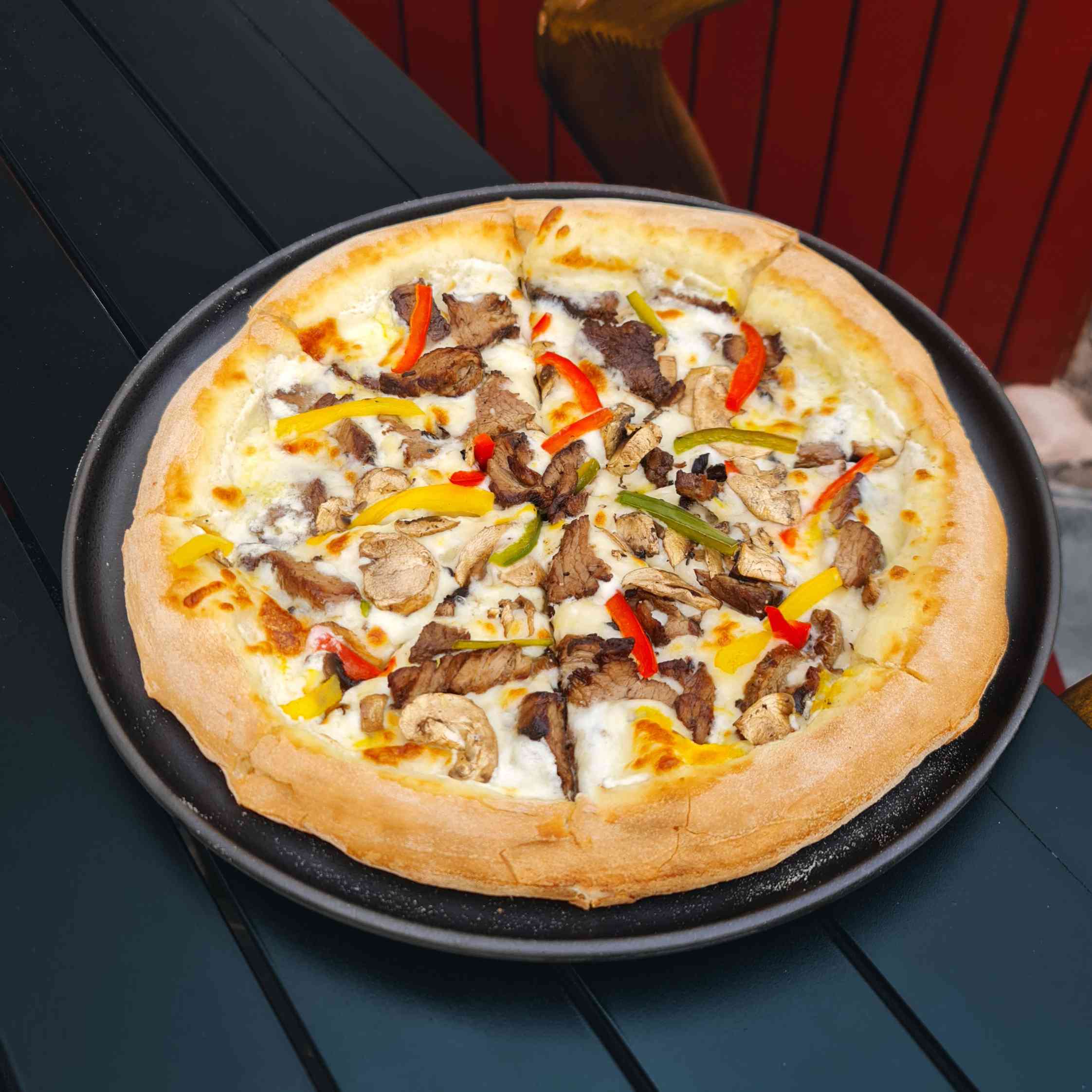 Roast beef + pizza cheese + bell pepper + mushrooms + black olives