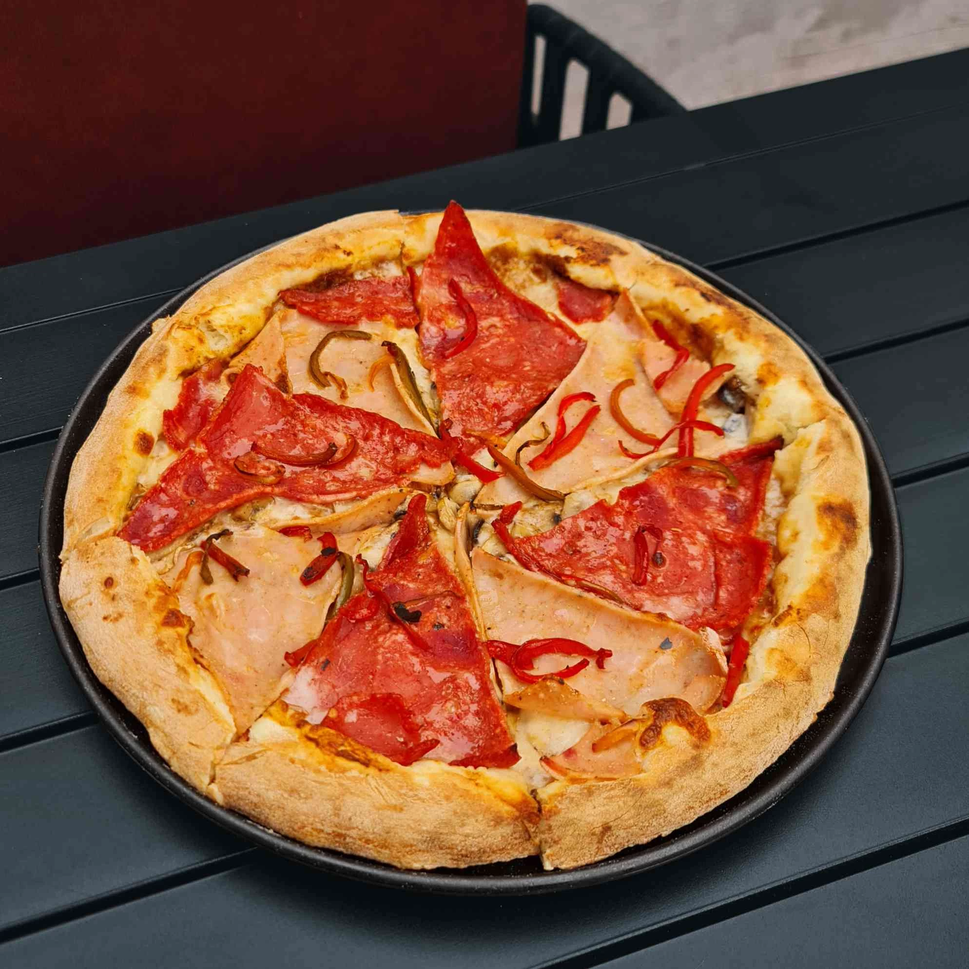 Bacon, Pizza cheese , Turkey Breast, Caramelized Bell Peppers, Marinara Sauce