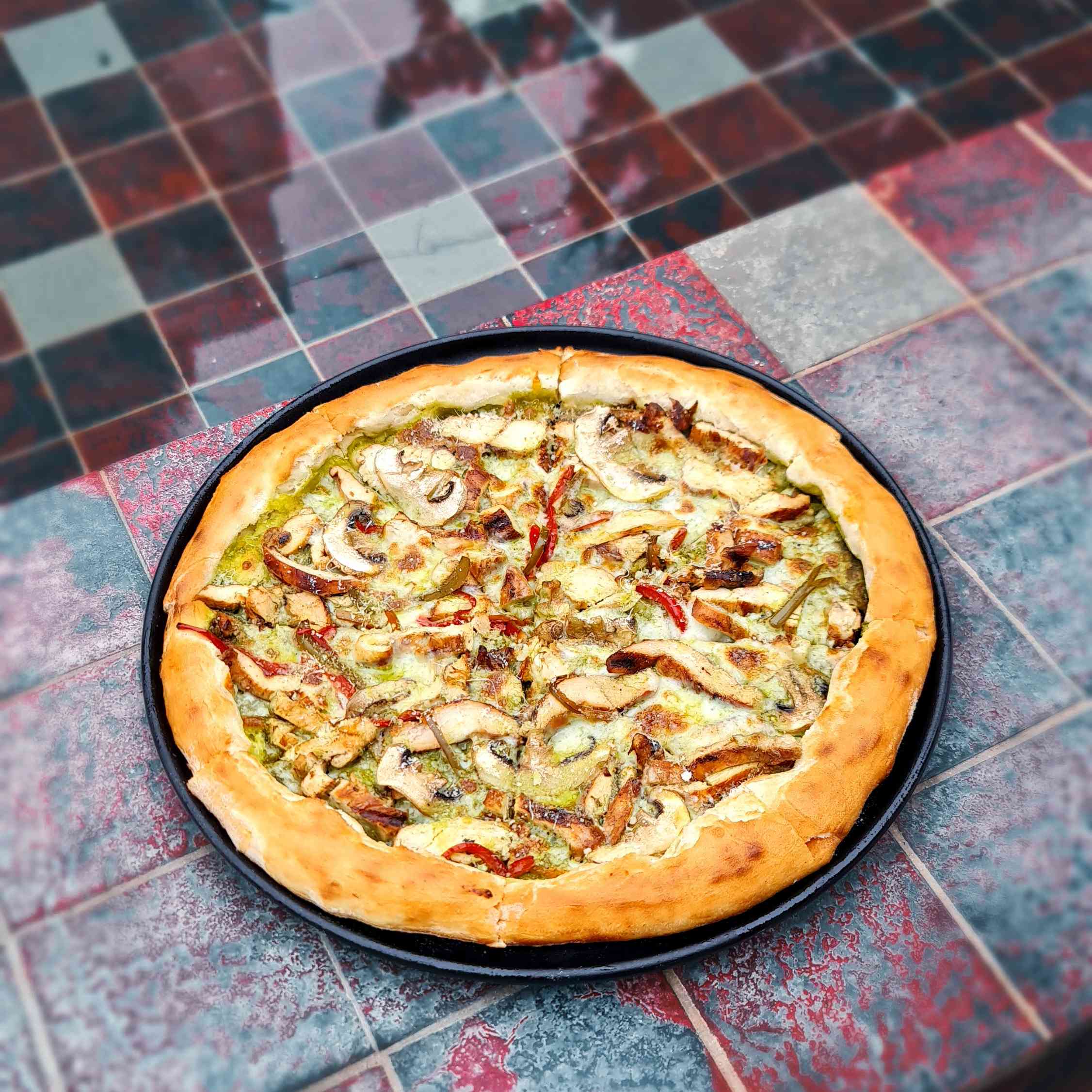 Seasoned grilled chicken. Pesto sauce. Pizza cheese.