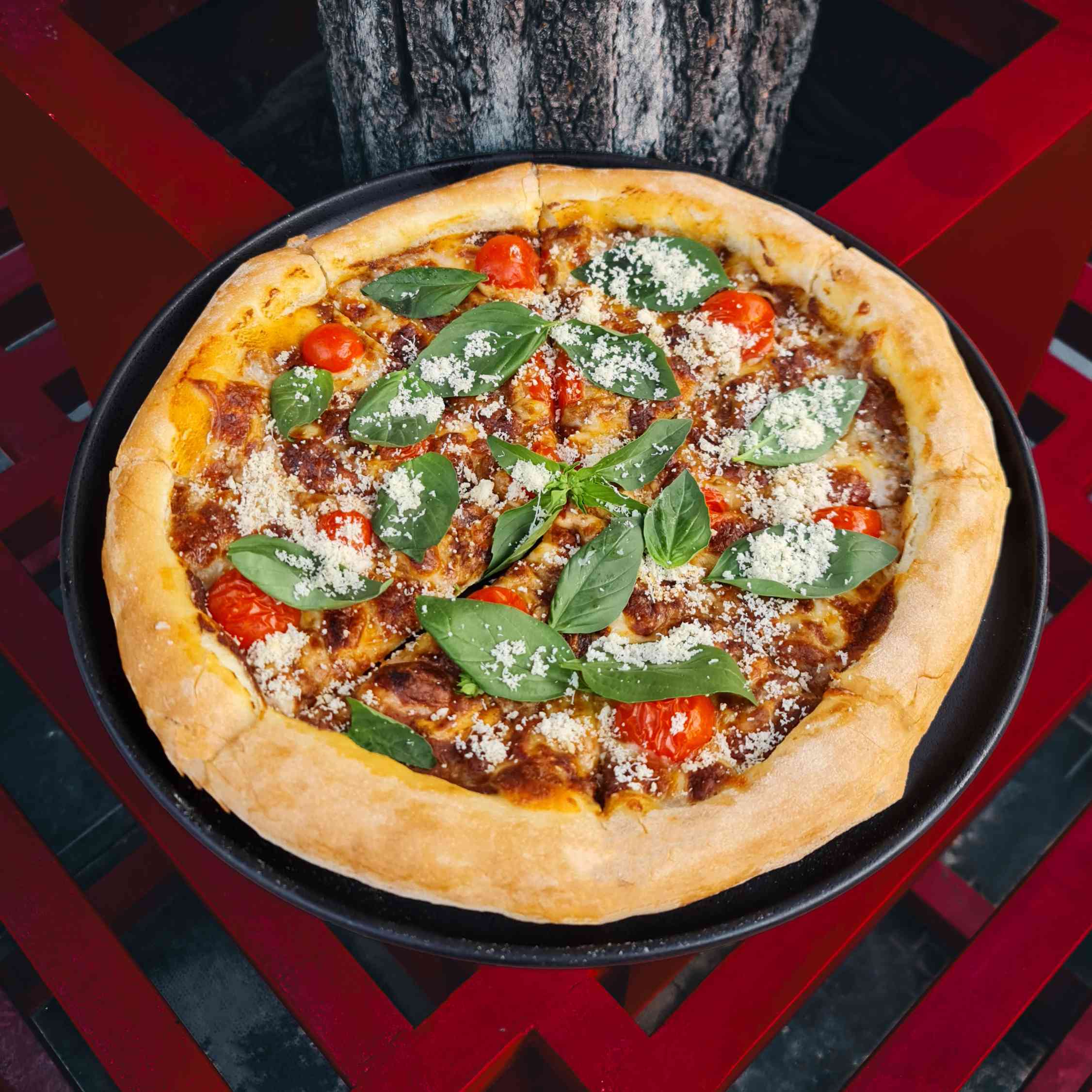 Pizza cheese. Cherry tomatoes. Marinara sauce. Italian basil.