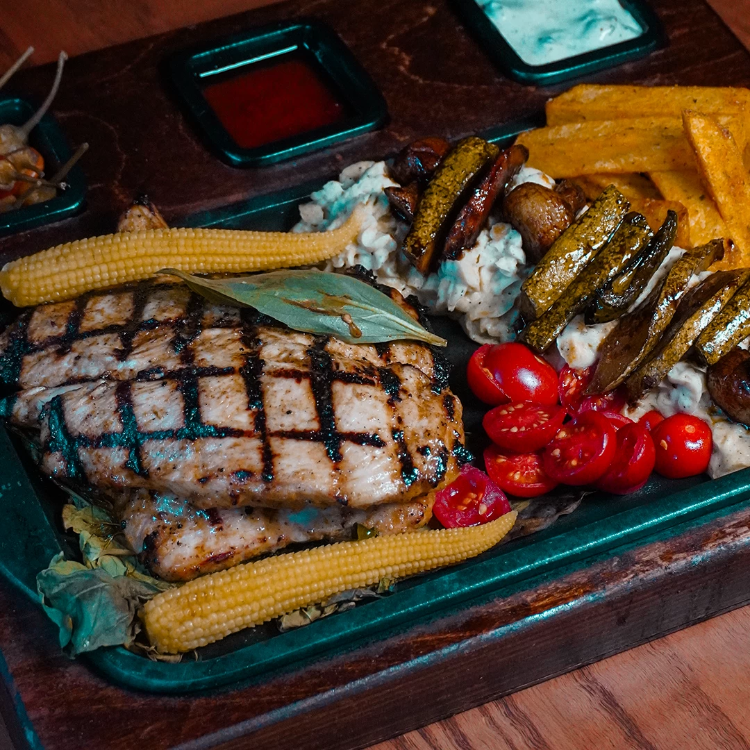350 grams of marinated veal fillet. Blanched vegetables. Mashed potatoes. Mushroom sauce.