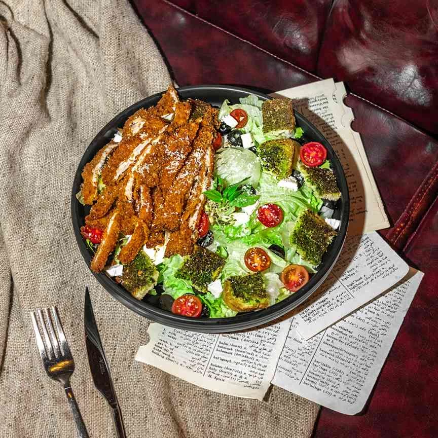 Lettuce, homemade Caesar dressing, garlic bread, parmesan, grilled fillet