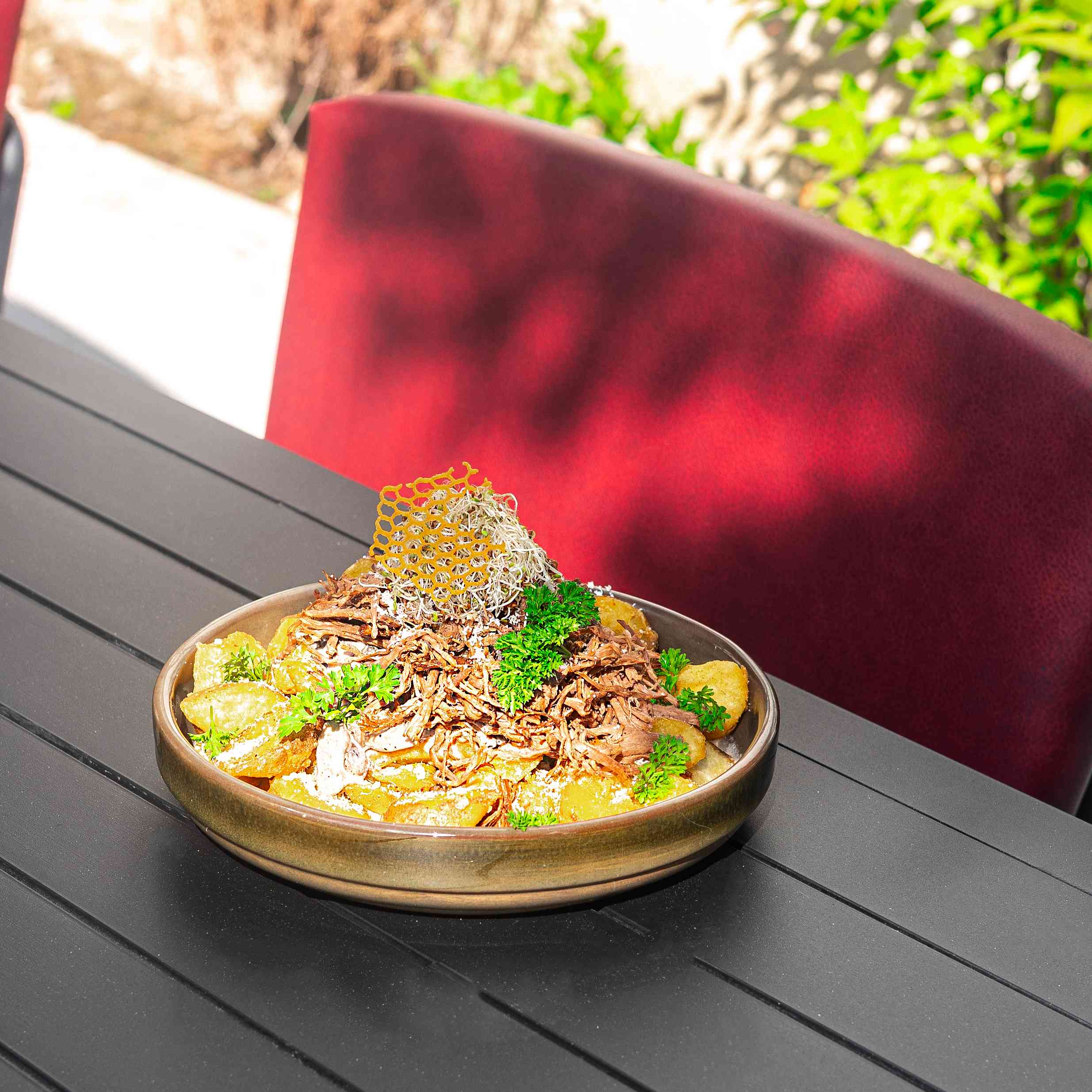 Potatoes, roast beef, mushroom sauce, parmesan cheese